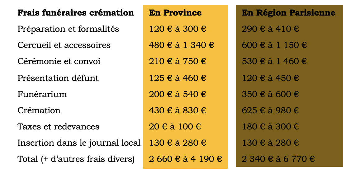 Le coût varie en fonction des crématoriums, des taxes et des dépenses supplémentaires liées aux obsèques et des cérémonies funéraires. (organisation, personnel, accueil, matériels, etc.). Mais en général, ce coût est compris entre 2500 et 3500 euros.